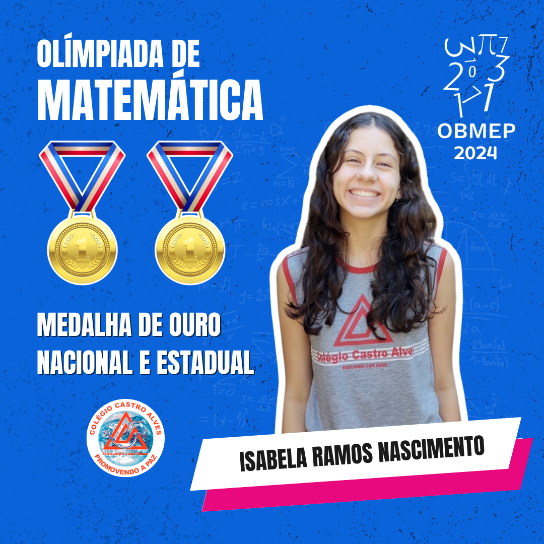 Isabela Ramos Nascimento, que foi aluna do Colégio Castro Alves desde o 1º Ano do ensino fundamental até o 7º ano/2024, conquistou nada menos que a medalha de OURO na OBMEP edição de 2024, essa que é uma das maiores olimpíadas de matemática de todo o Brasil e que já faz parte do nosso calendário acadêmico.