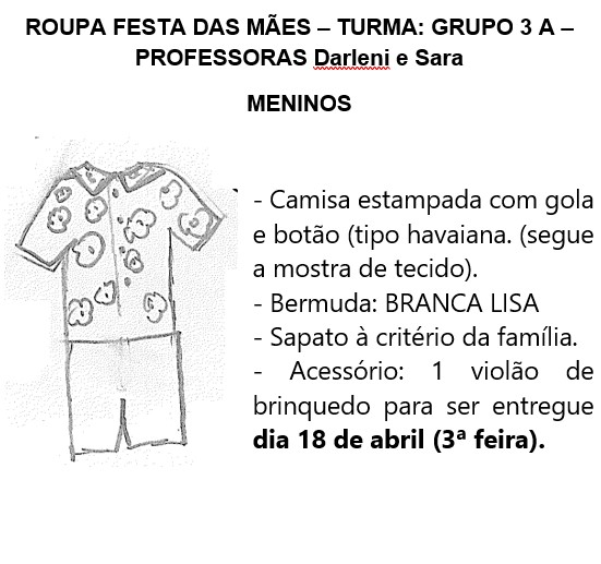 Atenção: Cada criança deverá vir de uniforme e trazer na bolsa a roupa feita para a festa, pois a professora fará a troca da roupa para a apresentação.